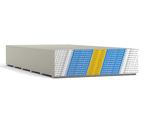 A tapered edge gypsum plaster base with a 100% recycled absorptive face paper.